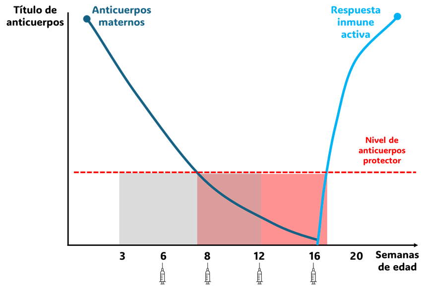 Algunos individuos pueden haber recibido más o menos anticuerpos maternos, lo que genera diferencias en la respuesta a las vacunas. Por esta razón, las pautas de vacunación actuales recomiendan administrar múltiples dosis de vacunas entre las 6 y las 16 semanas aproximadamente, cada 2 a 4 semanas, para cubrir lo mejor posible esa ventana de susceptibilidad (5).